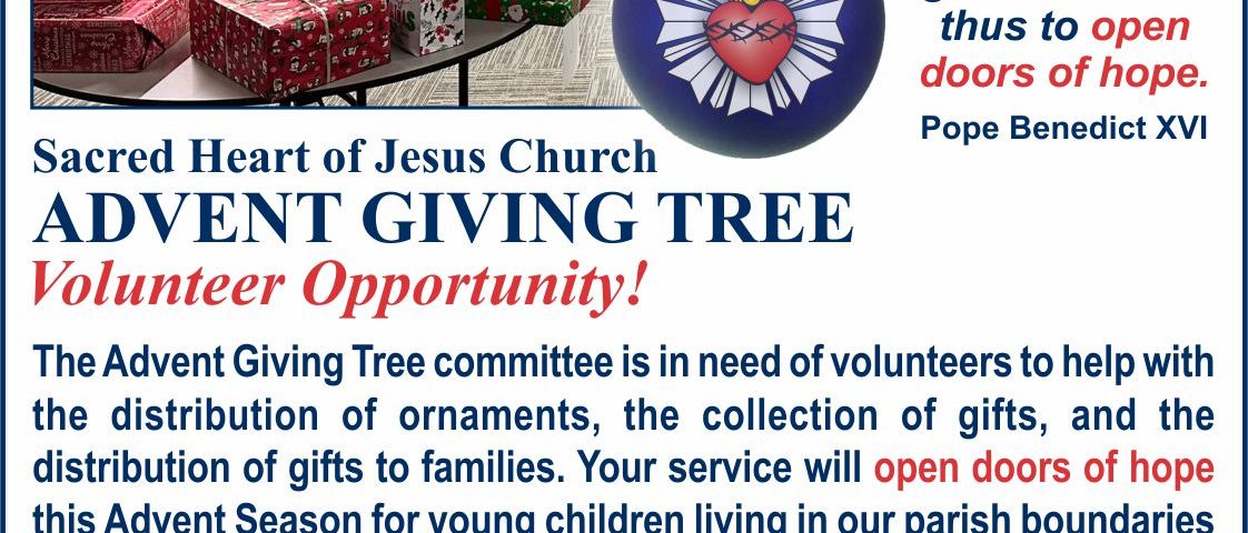 The Advent Giving Tree committee is in need of volunteers to help with the distribution of ornaments, the collection of gifts, and the distribution of gifts to families. Your service will open doors of hope this Advent Season for young children living in our parish boundaries who might otherwise be excluded from the joys of Christmas morning.